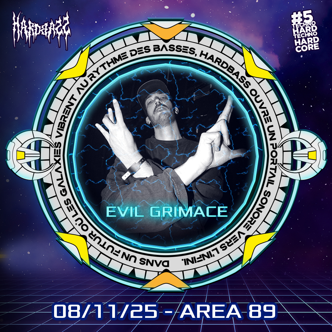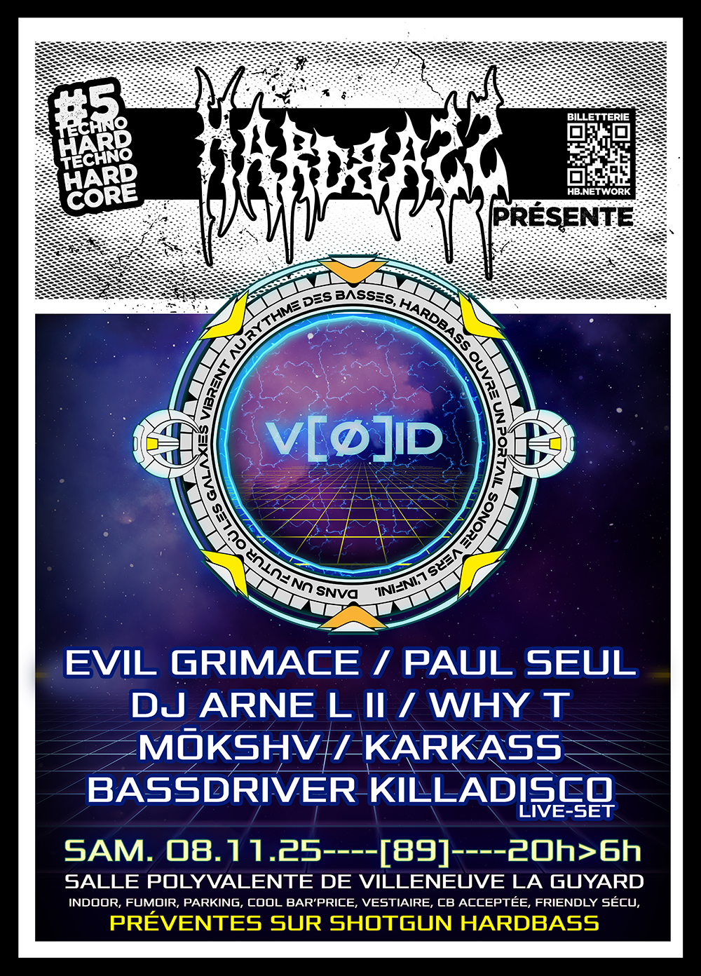 Conçue pour la cinquième soirée du collectif HARDBASS, cette affiche explore le thème du “VOID”, évoquant le vide intersidéral et la traversée d’un portail vers un autre monde.
